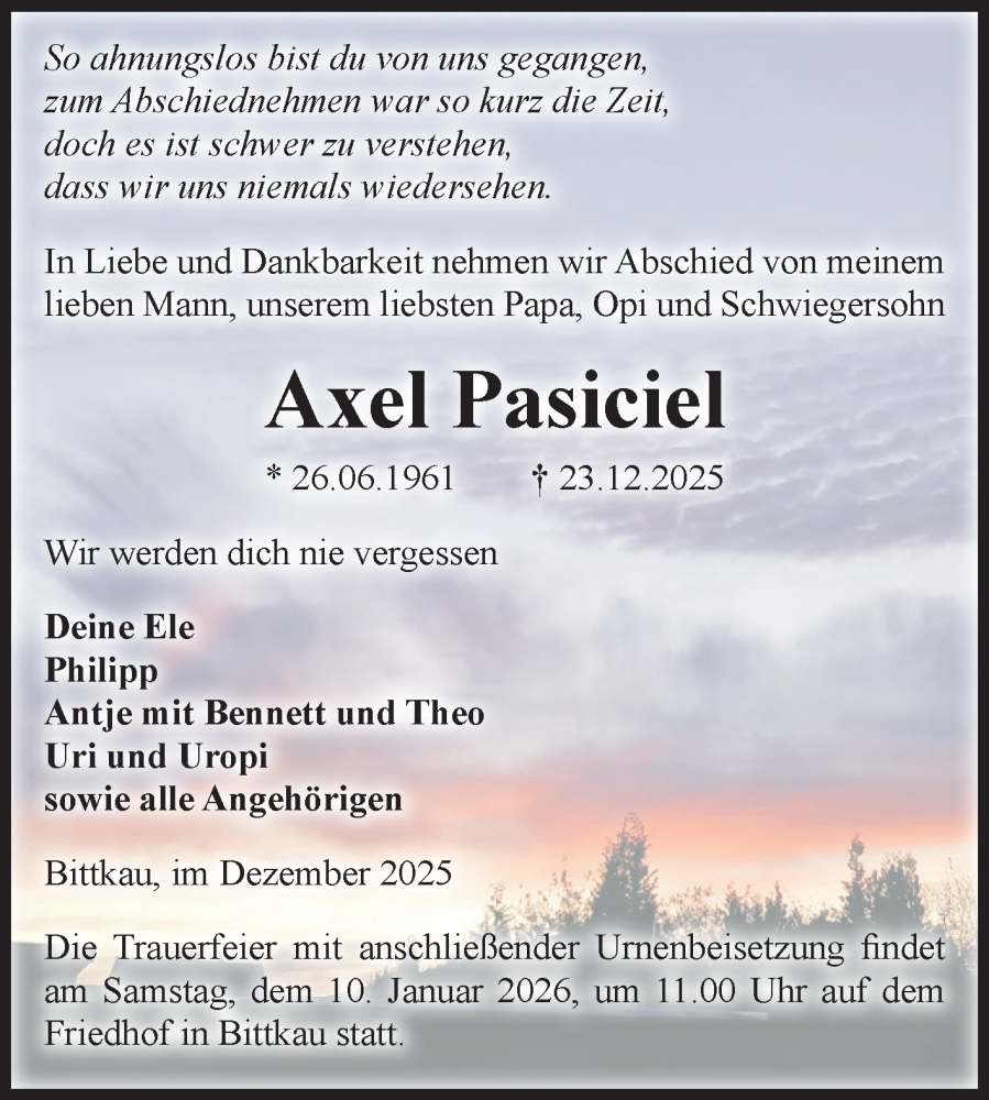 Hier finden Sie alle Traueranzeigen aus der Zeitung, die bisher für Axel Pasiciel erschienen sind. Weitere Traueranzeigen, die in der Zeitung erscheinen, werden hier ebenfalls aufgelistet