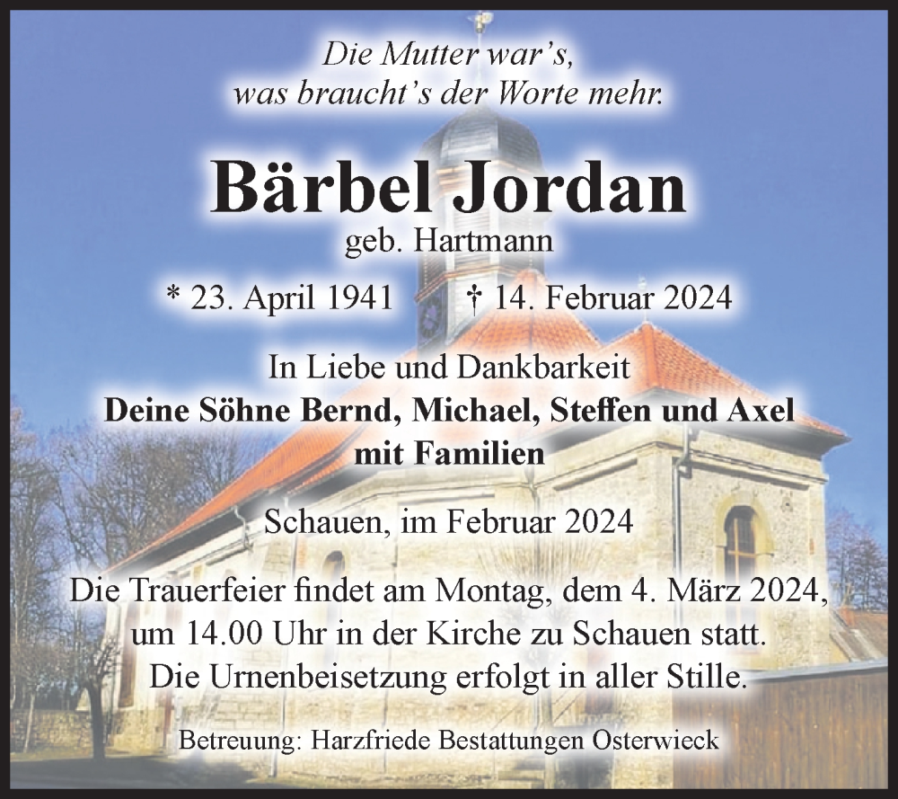 Hier finden Sie alle Traueranzeigen aus der Zeitung, die bisher für Bärbel Jordan erschienen sind. Weitere Traueranzeigen, die in der Zeitung erscheinen, werden hier ebenfalls aufgelistet
