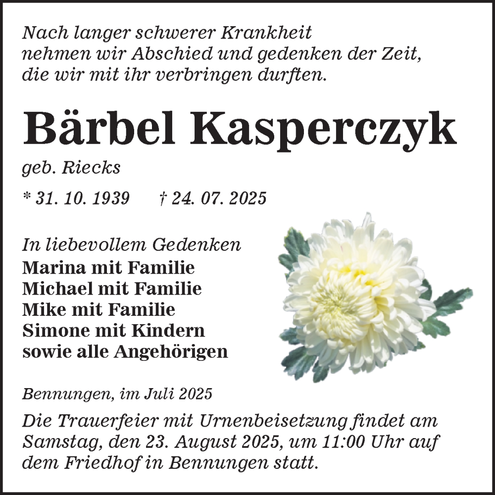 Hier finden Sie alle Traueranzeigen aus der Zeitung, die bisher für Bärbel Kasperczyk erschienen sind. Weitere Traueranzeigen, die in der Zeitung erscheinen, werden hier ebenfalls aufgelistet