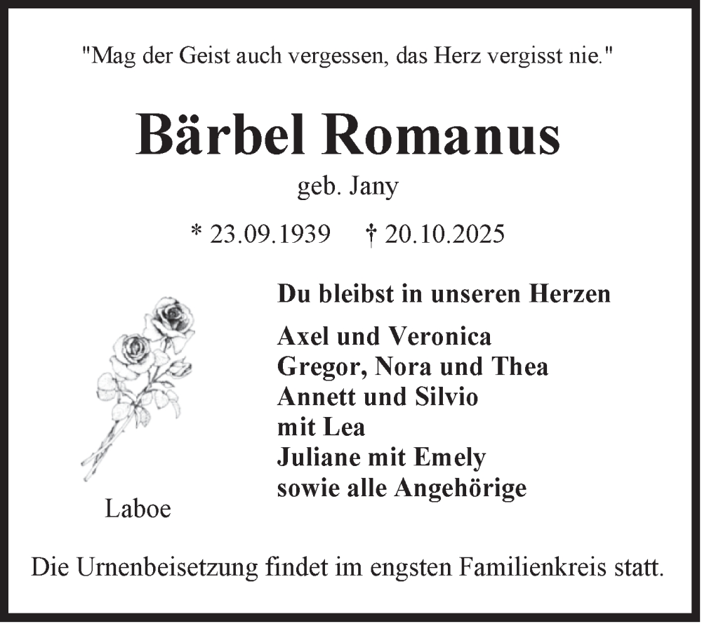 Hier finden Sie alle Traueranzeigen aus der Zeitung, die bisher für Bärbel Romanus erschienen sind. Weitere Traueranzeigen, die in der Zeitung erscheinen, werden hier ebenfalls aufgelistet