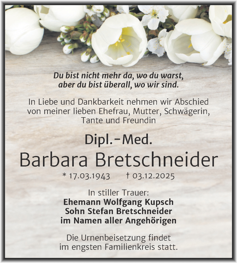 Hier finden Sie alle Traueranzeigen aus der Zeitung, die bisher für Barbara Bretschneider erschienen sind. Weitere Traueranzeigen, die in der Zeitung erscheinen, werden hier ebenfalls aufgelistet