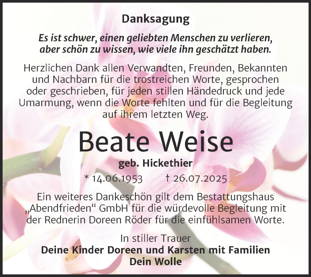 Hier finden Sie alle Traueranzeigen aus der Zeitung, die bisher für Beate Weise erschienen sind. Weitere Traueranzeigen, die in der Zeitung erscheinen, werden hier ebenfalls aufgelistet