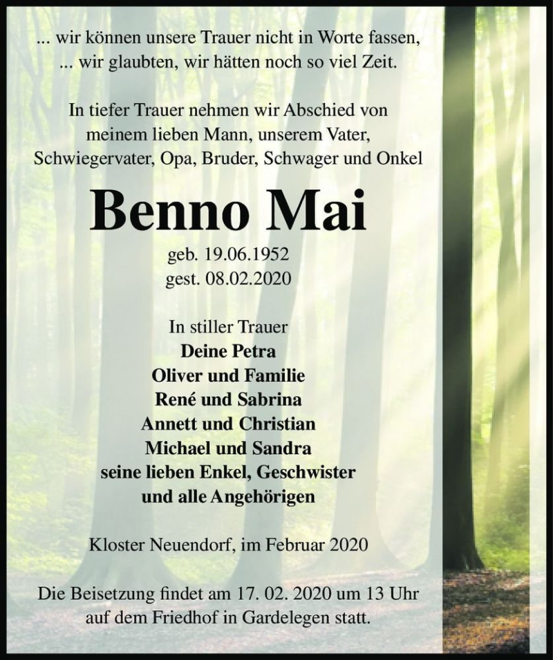 Hier finden Sie alle Traueranzeigen aus der Zeitung, die bisher für Benno Mai erschienen sind. Weitere Traueranzeigen, die in der Zeitung erscheinen, werden hier ebenfalls aufgelistet