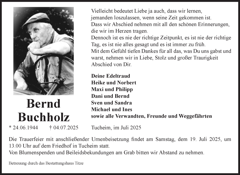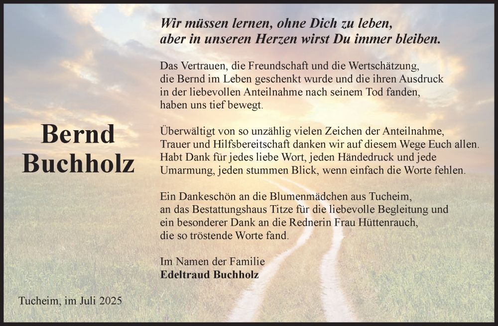 Hier finden Sie alle Traueranzeigen aus der Zeitung, die bisher für Bernd Buchholz erschienen sind. Weitere Traueranzeigen, die in der Zeitung erscheinen, werden hier ebenfalls aufgelistet