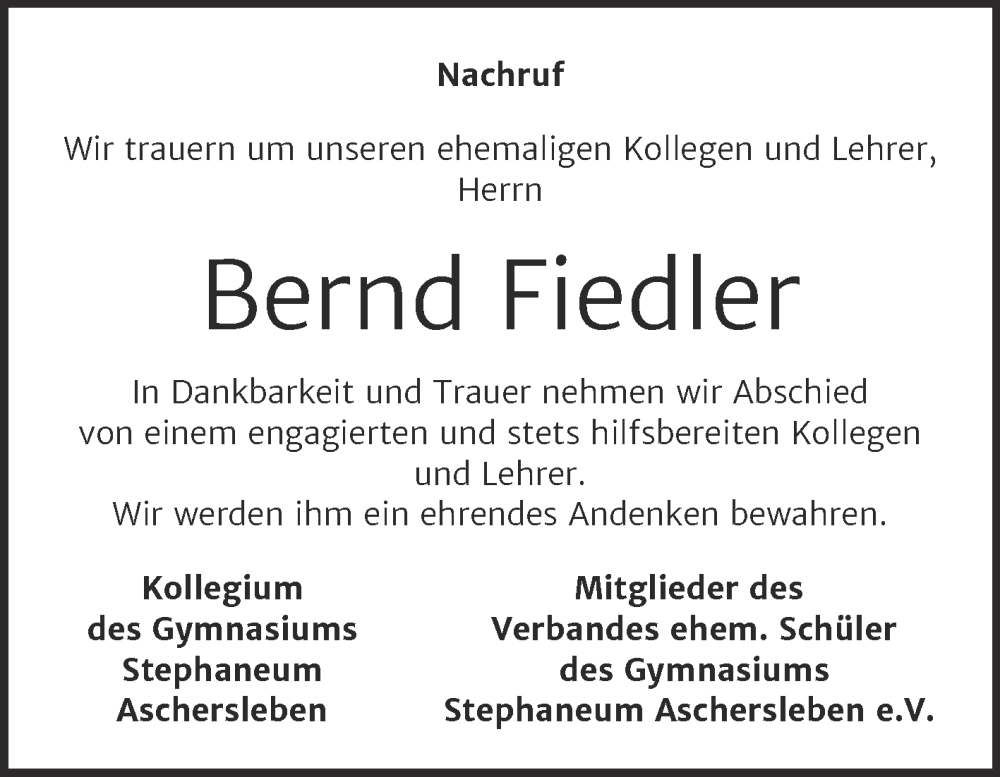 Hier finden Sie alle Traueranzeigen aus der Zeitung, die bisher für Bernd Fiedler erschienen sind. Weitere Traueranzeigen, die in der Zeitung erscheinen, werden hier ebenfalls aufgelistet