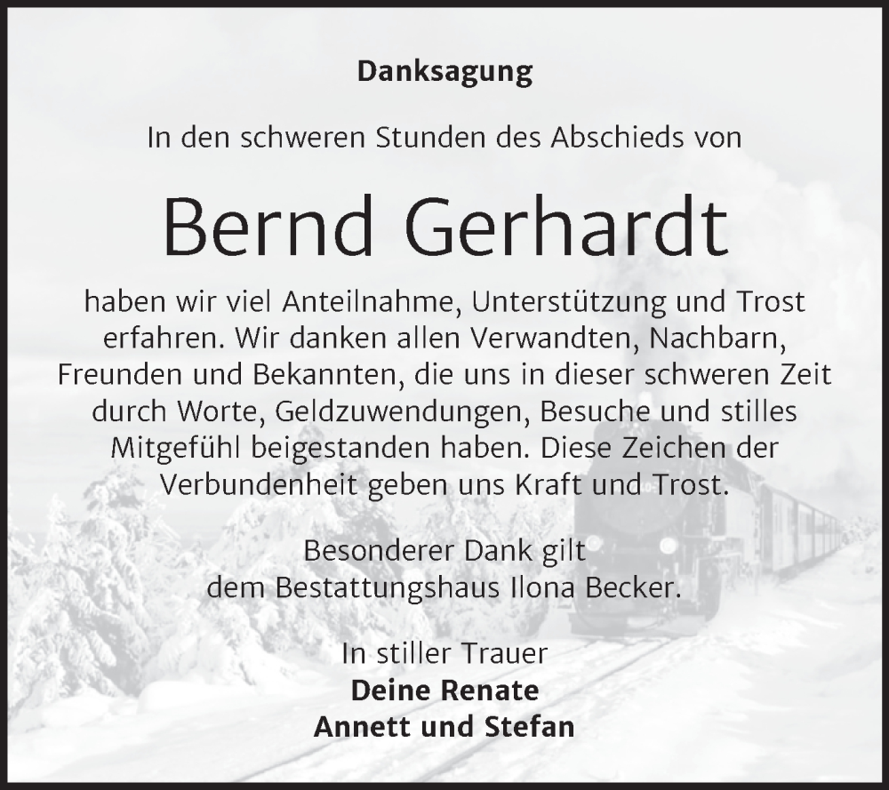 Hier finden Sie alle Traueranzeigen aus der Zeitung, die bisher für Bernd Gerhardt erschienen sind. Weitere Traueranzeigen, die in der Zeitung erscheinen, werden hier ebenfalls aufgelistet
