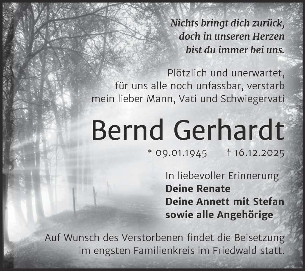 Hier finden Sie alle Traueranzeigen aus der Zeitung, die bisher für Bernd Gerhardt erschienen sind. Weitere Traueranzeigen, die in der Zeitung erscheinen, werden hier ebenfalls aufgelistet