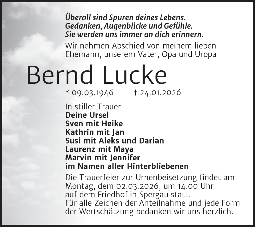 Hier finden Sie alle Traueranzeigen aus der Zeitung, die bisher für Bernd Lucke erschienen sind. Weitere Traueranzeigen, die in der Zeitung erscheinen, werden hier ebenfalls aufgelistet