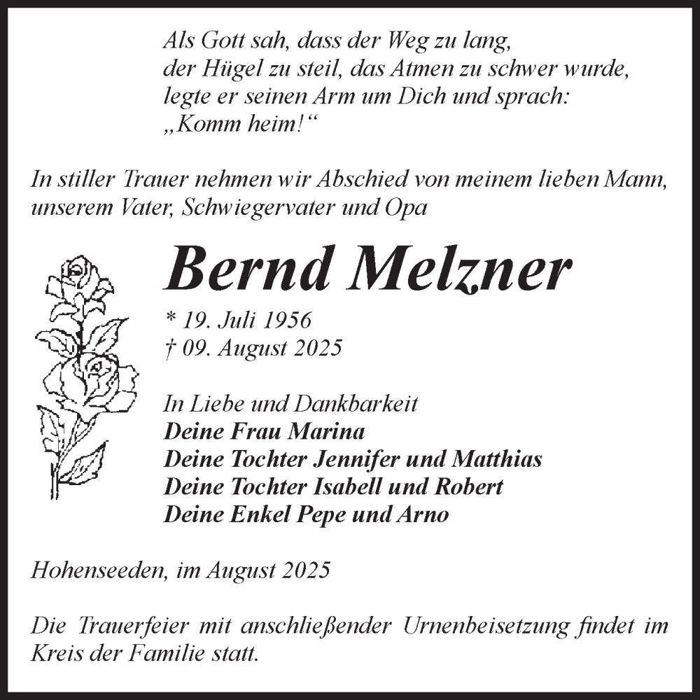Hier finden Sie alle Traueranzeigen aus der Zeitung, die bisher für Bernd Melzner erschienen sind. Weitere Traueranzeigen, die in der Zeitung erscheinen, werden hier ebenfalls aufgelistet