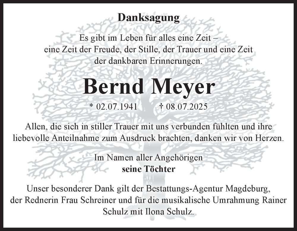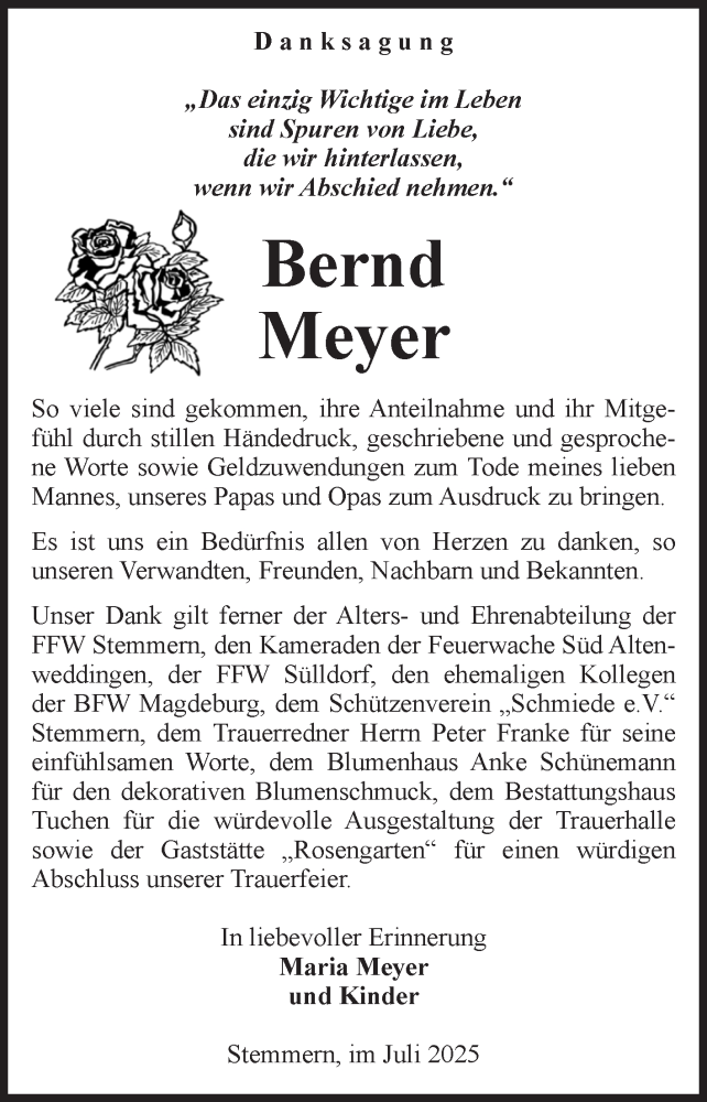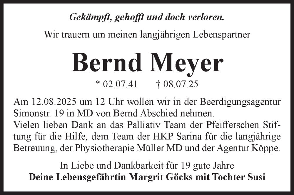 Hier finden Sie alle Traueranzeigen aus der Zeitung, die bisher für Bernd Meyer erschienen sind. Weitere Traueranzeigen, die in der Zeitung erscheinen, werden hier ebenfalls aufgelistet