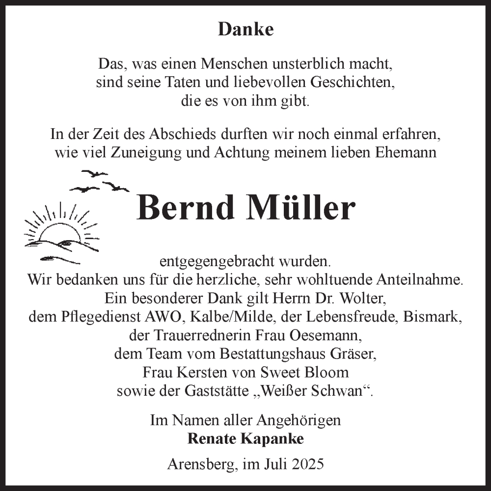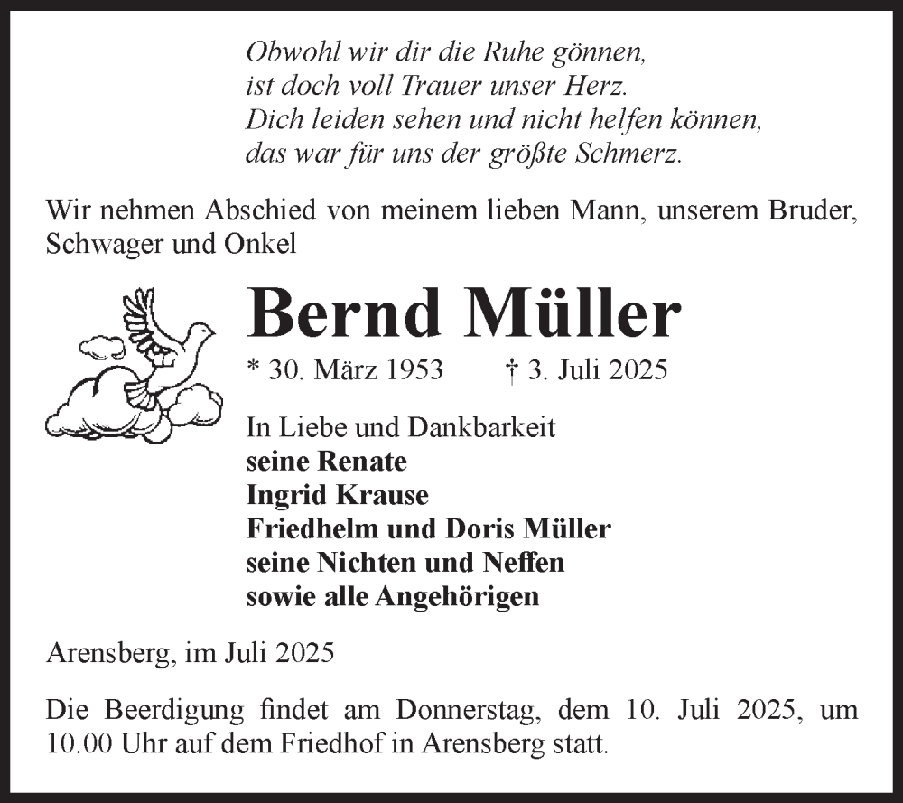 Hier finden Sie alle Traueranzeigen aus der Zeitung, die bisher für Bernd Müller erschienen sind. Weitere Traueranzeigen, die in der Zeitung erscheinen, werden hier ebenfalls aufgelistet