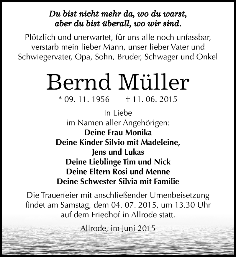 Hier finden Sie alle Traueranzeigen aus der Zeitung, die bisher für Bernd Müller erschienen sind. Weitere Traueranzeigen, die in der Zeitung erscheinen, werden hier ebenfalls aufgelistet