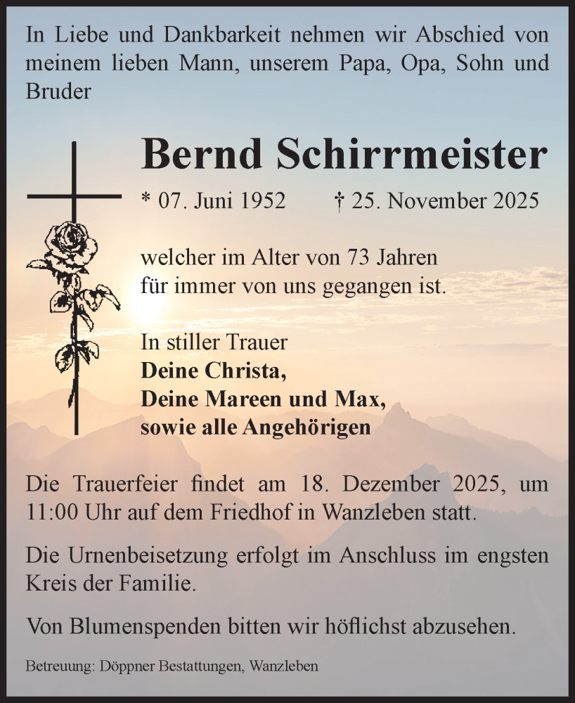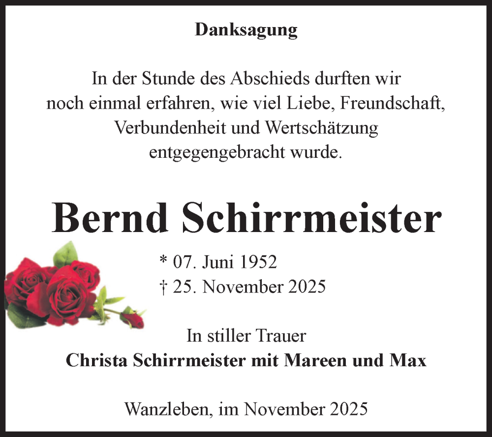 Hier finden Sie alle Traueranzeigen aus der Zeitung, die bisher für Bernd Schirrmeister erschienen sind. Weitere Traueranzeigen, die in der Zeitung erscheinen, werden hier ebenfalls aufgelistet
