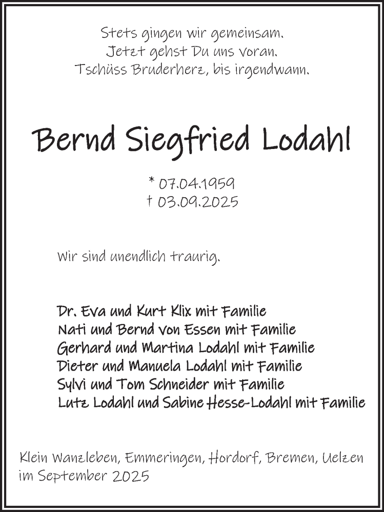 Hier finden Sie alle Traueranzeigen aus der Zeitung, die bisher für Bernd Siegfried Lodahl erschienen sind. Weitere Traueranzeigen, die in der Zeitung erscheinen, werden hier ebenfalls aufgelistet