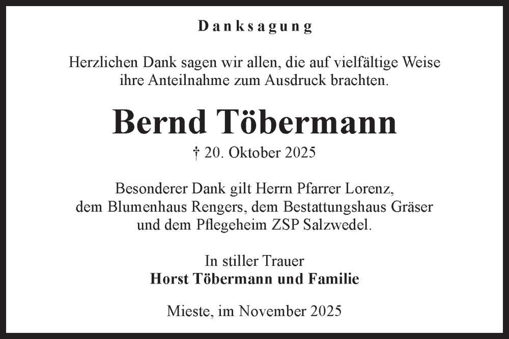 Hier finden Sie alle Traueranzeigen aus der Zeitung, die bisher für Bernd Töbermann erschienen sind. Weitere Traueranzeigen, die in der Zeitung erscheinen, werden hier ebenfalls aufgelistet