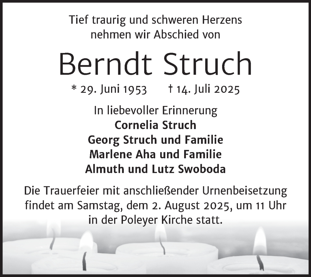 Hier finden Sie alle Traueranzeigen aus der Zeitung, die bisher für Berndt Struch erschienen sind. Weitere Traueranzeigen, die in der Zeitung erscheinen, werden hier ebenfalls aufgelistet