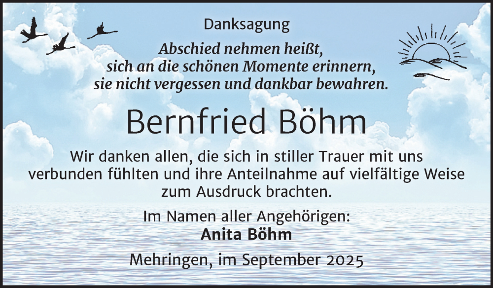 Hier finden Sie alle Traueranzeigen aus der Zeitung, die bisher für Bernfried Böhm erschienen sind. Weitere Traueranzeigen, die in der Zeitung erscheinen, werden hier ebenfalls aufgelistet