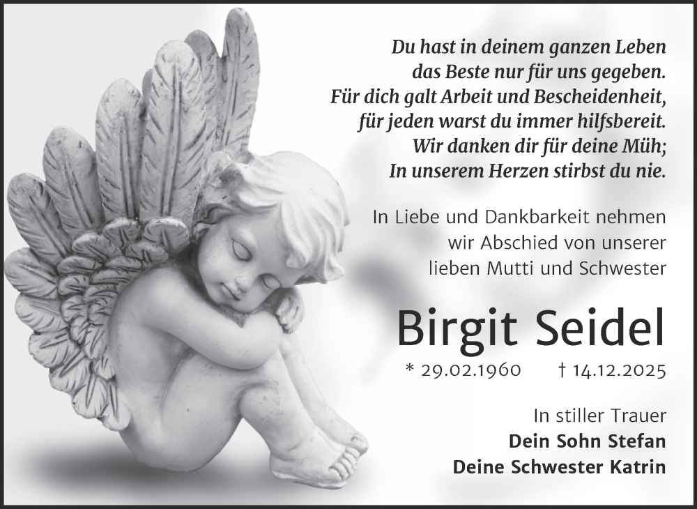 Hier finden Sie alle Traueranzeigen aus der Zeitung, die bisher für Birgit Seidel erschienen sind. Weitere Traueranzeigen, die in der Zeitung erscheinen, werden hier ebenfalls aufgelistet