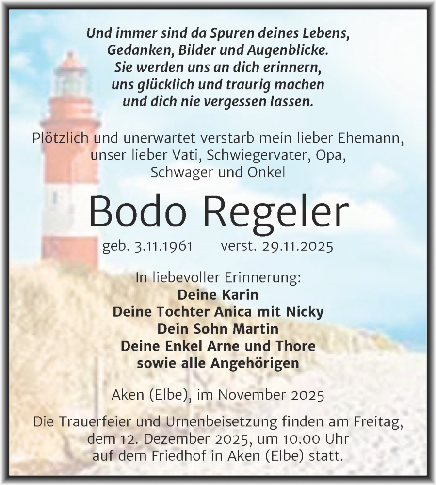 Hier finden Sie alle Traueranzeigen aus der Zeitung, die bisher für Bodo Regeler erschienen sind. Weitere Traueranzeigen, die in der Zeitung erscheinen, werden hier ebenfalls aufgelistet