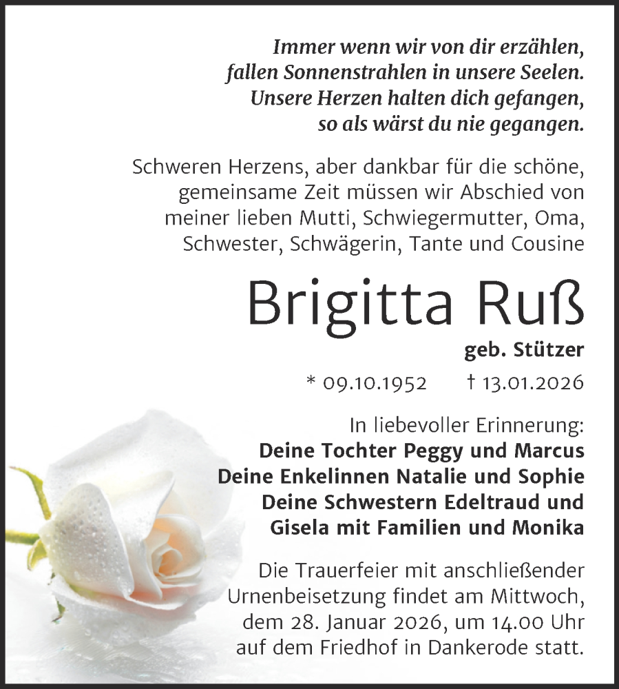 Hier finden Sie alle Traueranzeigen aus der Zeitung, die bisher für Brigitta Ruß erschienen sind. Weitere Traueranzeigen, die in der Zeitung erscheinen, werden hier ebenfalls aufgelistet