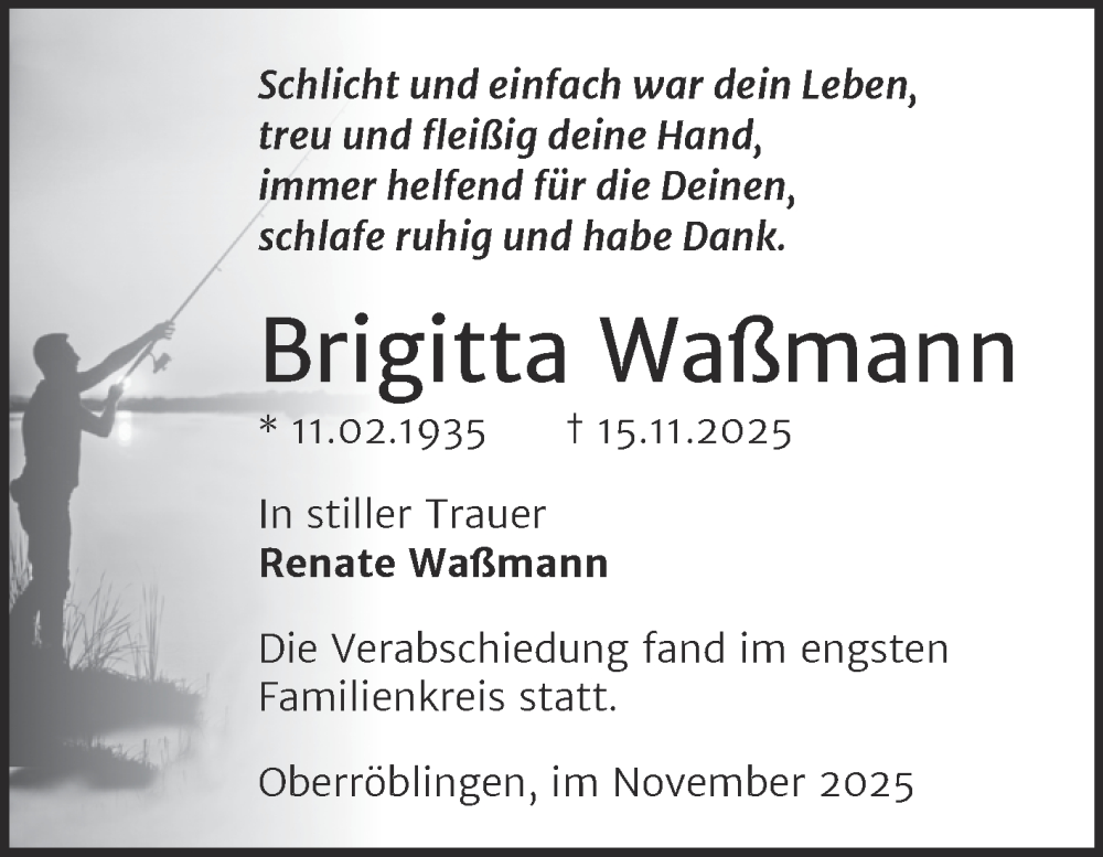 Hier finden Sie alle Traueranzeigen aus der Zeitung, die bisher für Brigitta Waßmann erschienen sind. Weitere Traueranzeigen, die in der Zeitung erscheinen, werden hier ebenfalls aufgelistet