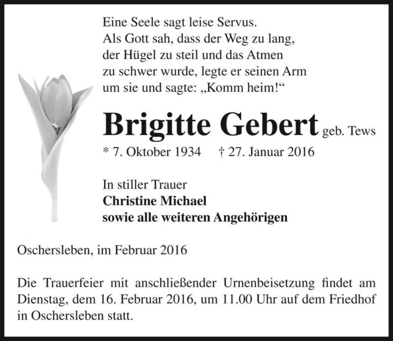 Hier finden Sie alle Traueranzeigen aus der Zeitung, die bisher für Brigitte Gebert (geb. Tews) erschienen sind. Weitere Traueranzeigen, die in der Zeitung erscheinen, werden hier ebenfalls aufgelistet