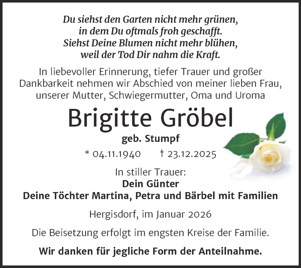 Hier finden Sie alle Traueranzeigen aus der Zeitung, die bisher für Brigitte Gröbel erschienen sind. Weitere Traueranzeigen, die in der Zeitung erscheinen, werden hier ebenfalls aufgelistet