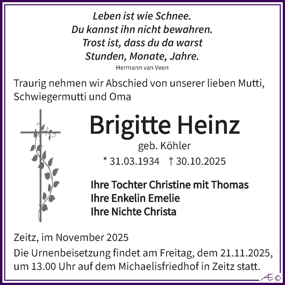 Hier finden Sie alle Traueranzeigen aus der Zeitung, die bisher für Brigitte Heinz erschienen sind. Weitere Traueranzeigen, die in der Zeitung erscheinen, werden hier ebenfalls aufgelistet