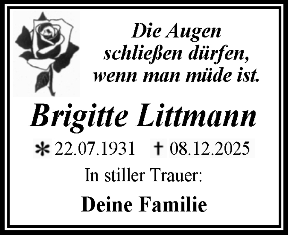 Hier finden Sie alle Traueranzeigen aus der Zeitung, die bisher für Brigitte Littmann erschienen sind. Weitere Traueranzeigen, die in der Zeitung erscheinen, werden hier ebenfalls aufgelistet