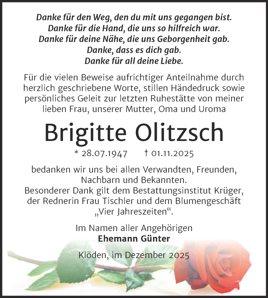 Hier finden Sie alle Traueranzeigen aus der Zeitung, die bisher für Brigitte Olitzsch erschienen sind. Weitere Traueranzeigen, die in der Zeitung erscheinen, werden hier ebenfalls aufgelistet