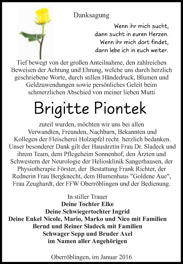 Hier finden Sie alle Traueranzeigen aus der Zeitung, die bisher für Brigitte Piontek erschienen sind. Weitere Traueranzeigen, die in der Zeitung erscheinen, werden hier ebenfalls aufgelistet