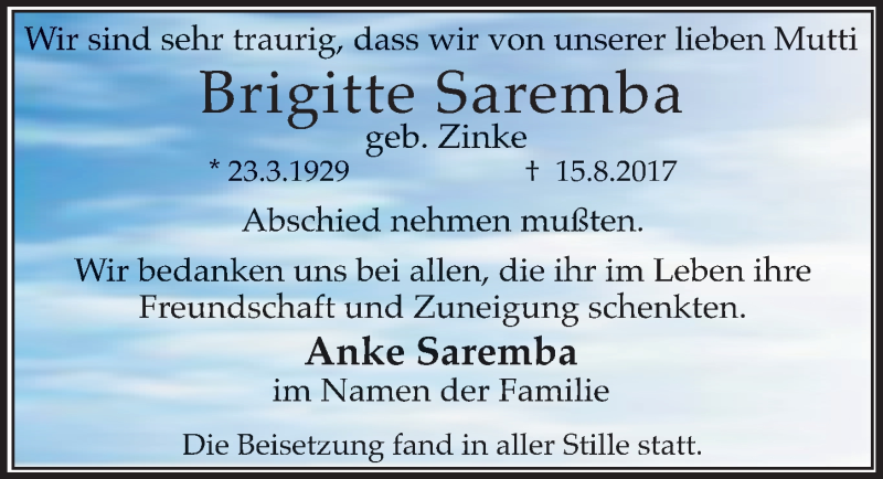 Hier finden Sie alle Traueranzeigen aus der Zeitung, die bisher für Brigitte Saremba erschienen sind. Weitere Traueranzeigen, die in der Zeitung erscheinen, werden hier ebenfalls aufgelistet