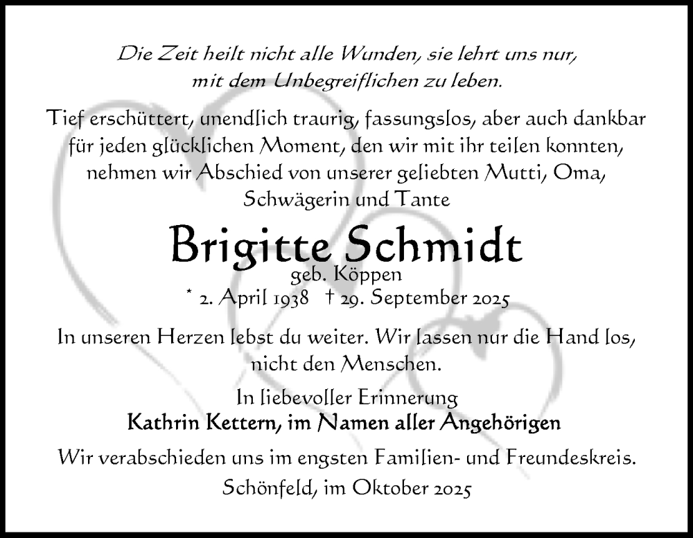 Hier finden Sie alle Traueranzeigen aus der Zeitung, die bisher für Brigitte Schmidt erschienen sind. Weitere Traueranzeigen, die in der Zeitung erscheinen, werden hier ebenfalls aufgelistet