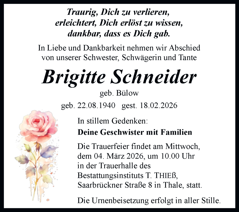 Hier finden Sie alle Traueranzeigen aus der Zeitung, die bisher für Brigitte Schneider erschienen sind. Weitere Traueranzeigen, die in der Zeitung erscheinen, werden hier ebenfalls aufgelistet