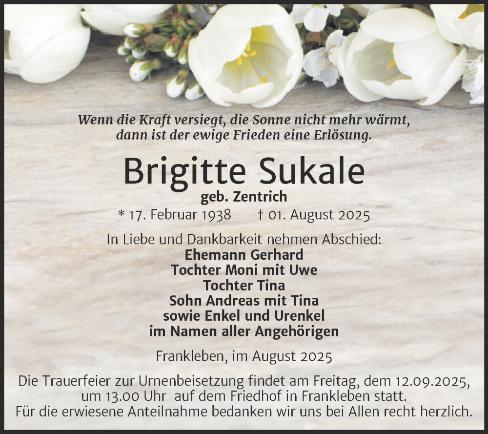 Hier finden Sie alle Traueranzeigen aus der Zeitung, die bisher für Brigitte Sukale erschienen sind. Weitere Traueranzeigen, die in der Zeitung erscheinen, werden hier ebenfalls aufgelistet