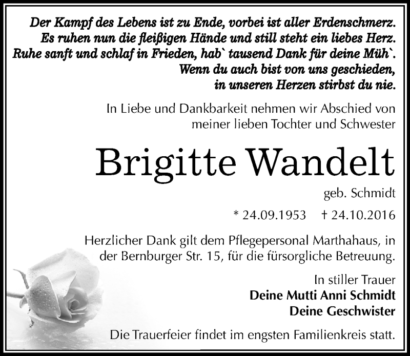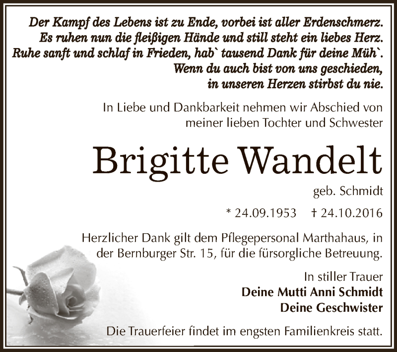 Hier finden Sie alle Traueranzeigen aus der Zeitung, die bisher für Brigitte Wandelt erschienen sind. Weitere Traueranzeigen, die in der Zeitung erscheinen, werden hier ebenfalls aufgelistet