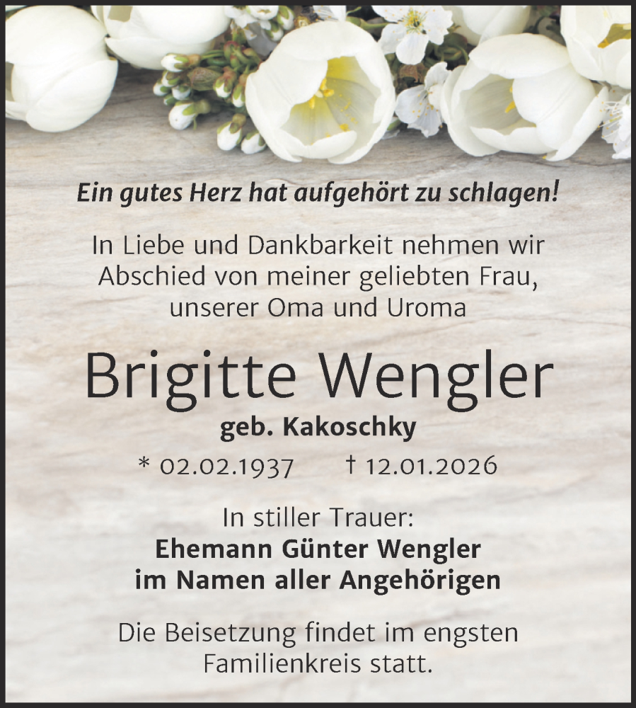 Hier finden Sie alle Traueranzeigen aus der Zeitung, die bisher für Brigitte Wengler erschienen sind. Weitere Traueranzeigen, die in der Zeitung erscheinen, werden hier ebenfalls aufgelistet