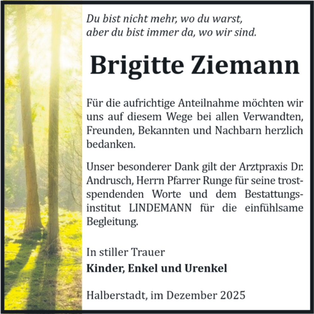 Hier finden Sie alle Traueranzeigen aus der Zeitung, die bisher für Brigitte Ziemann erschienen sind. Weitere Traueranzeigen, die in der Zeitung erscheinen, werden hier ebenfalls aufgelistet