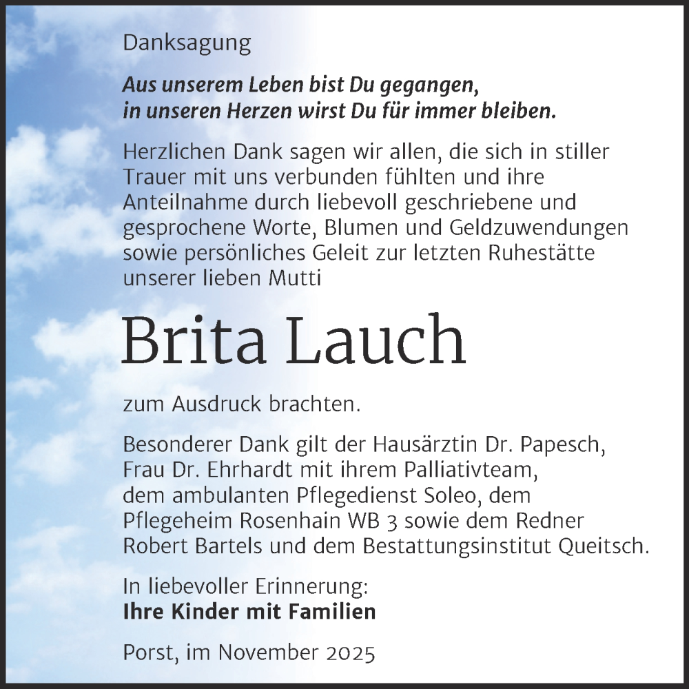 Hier finden Sie alle Traueranzeigen aus der Zeitung, die bisher für Brita Lauch erschienen sind. Weitere Traueranzeigen, die in der Zeitung erscheinen, werden hier ebenfalls aufgelistet