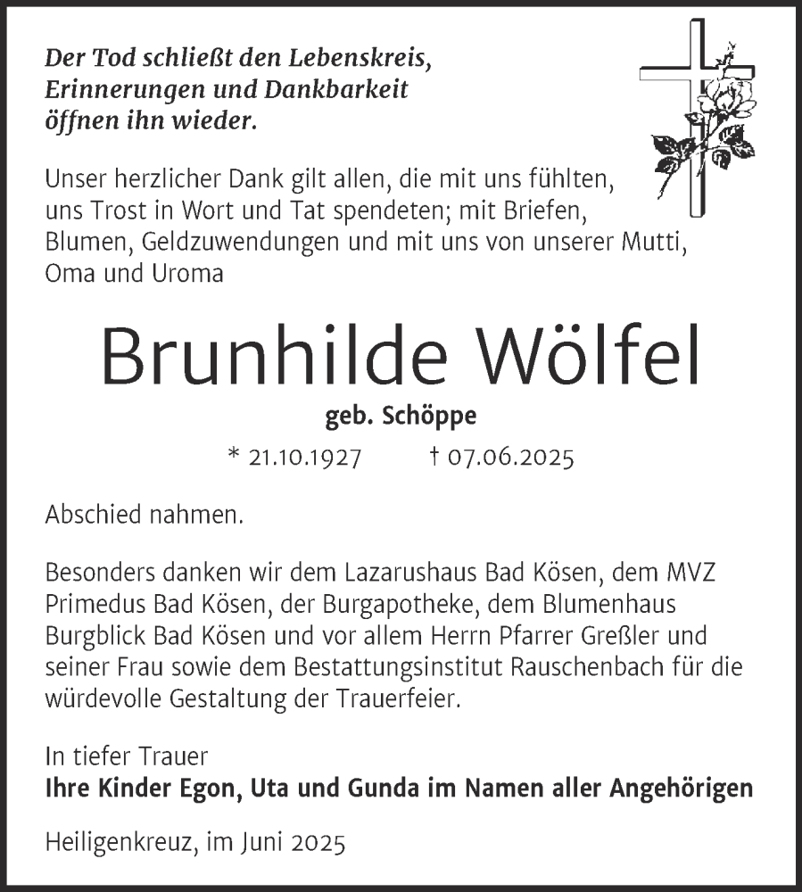 Hier finden Sie alle Traueranzeigen aus der Zeitung, die bisher für Brunhilde Wölfel erschienen sind. Weitere Traueranzeigen, die in der Zeitung erscheinen, werden hier ebenfalls aufgelistet