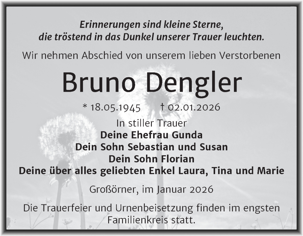 Hier finden Sie alle Traueranzeigen aus der Zeitung, die bisher für Bruno Dengler erschienen sind. Weitere Traueranzeigen, die in der Zeitung erscheinen, werden hier ebenfalls aufgelistet