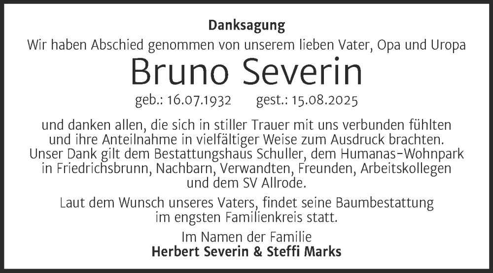 Hier finden Sie alle Traueranzeigen aus der Zeitung, die bisher für Bruno Severin erschienen sind. Weitere Traueranzeigen, die in der Zeitung erscheinen, werden hier ebenfalls aufgelistet