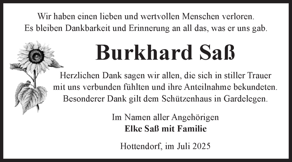 Hier finden Sie alle Traueranzeigen aus der Zeitung, die bisher für Burkhard Saß erschienen sind. Weitere Traueranzeigen, die in der Zeitung erscheinen, werden hier ebenfalls aufgelistet