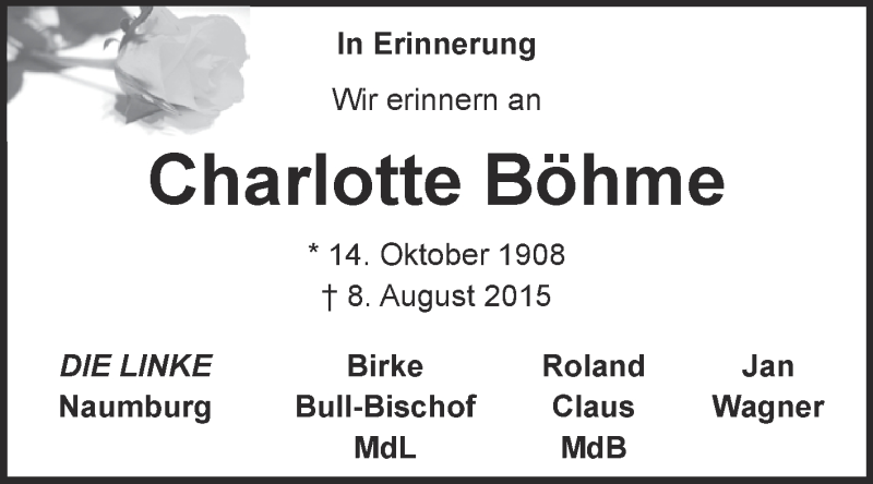 Hier finden Sie alle Traueranzeigen aus der Zeitung, die bisher für Charlotte Böhme erschienen sind. Weitere Traueranzeigen, die in der Zeitung erscheinen, werden hier ebenfalls aufgelistet
