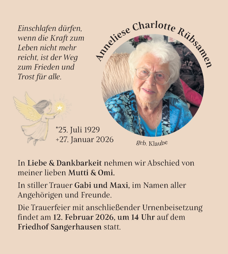 Hier finden Sie alle Traueranzeigen aus der Zeitung, die bisher für Charlotte Klaube erschienen sind. Weitere Traueranzeigen, die in der Zeitung erscheinen, werden hier ebenfalls aufgelistet
