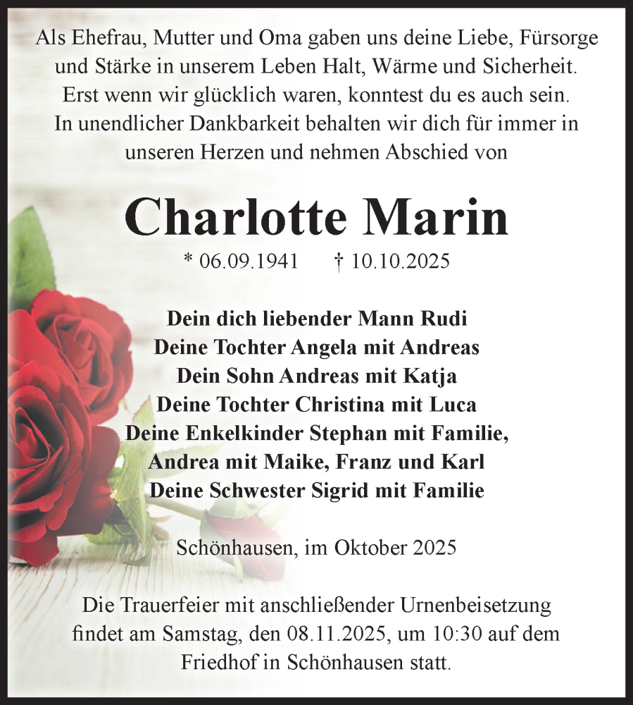 Hier finden Sie alle Traueranzeigen aus der Zeitung, die bisher für Charlotte Marin erschienen sind. Weitere Traueranzeigen, die in der Zeitung erscheinen, werden hier ebenfalls aufgelistet
