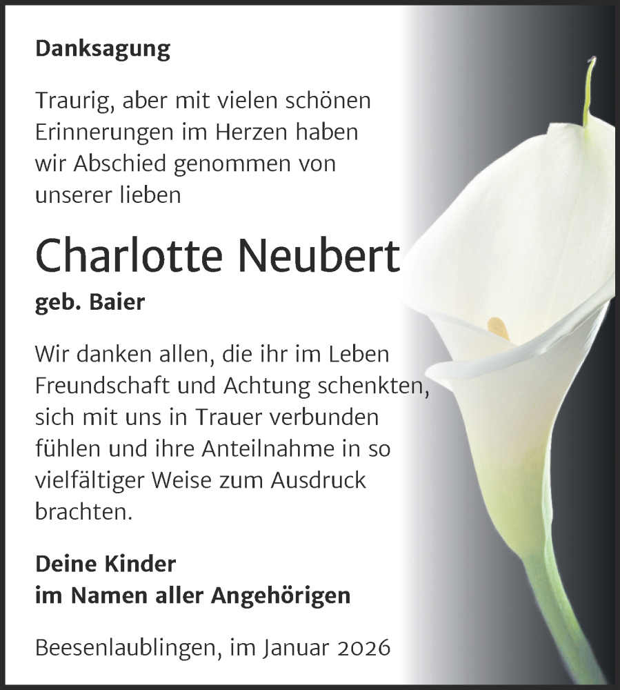 Hier finden Sie alle Traueranzeigen aus der Zeitung, die bisher für Charlotte Neubert erschienen sind. Weitere Traueranzeigen, die in der Zeitung erscheinen, werden hier ebenfalls aufgelistet