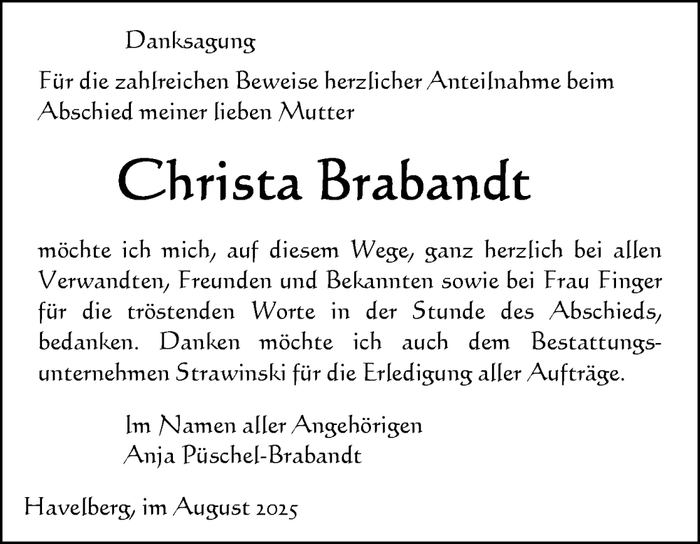 Hier finden Sie alle Traueranzeigen aus der Zeitung, die bisher für Christa Brabandt erschienen sind. Weitere Traueranzeigen, die in der Zeitung erscheinen, werden hier ebenfalls aufgelistet