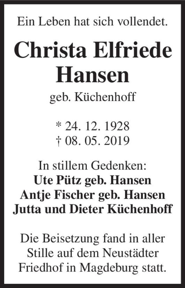 Hier finden Sie alle Traueranzeigen aus der Zeitung, die bisher für Christa Elfriede Hansen (geb. Küchenhoff) erschienen sind. Weitere Traueranzeigen, die in der Zeitung erscheinen, werden hier ebenfalls aufgelistet