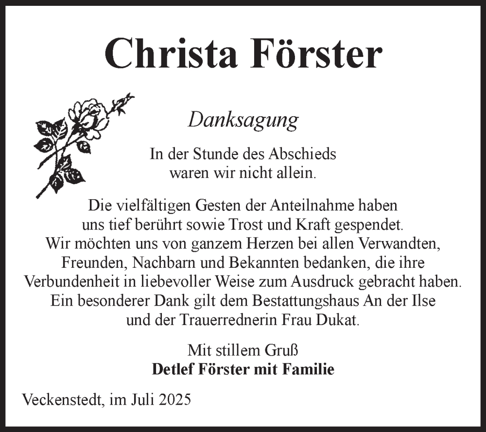 Hier finden Sie alle Traueranzeigen aus der Zeitung, die bisher für Christa Förster erschienen sind. Weitere Traueranzeigen, die in der Zeitung erscheinen, werden hier ebenfalls aufgelistet